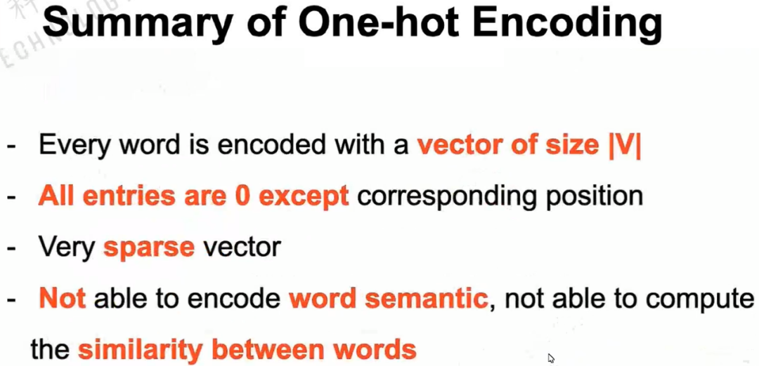 独热编码是NLP领域最简单的一种单词表示法。One-hot Encoding就是一个单词用长度为 的向量表示,其中只有一个位置为 ,其余位置为 , 为语料中词库的大小。