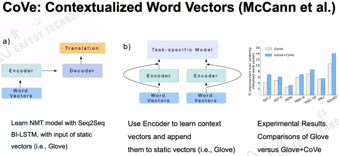从下图b)中我们可以知道,由于Encoder和Decoder都是BI-LSTM模型,模型本身含有语句上下文的信息。因此,用静态词向量输入Encoder编码器就可以得到含有上下文的词向量。我们把含有上下文的词向量和静态的词向量拼接在一起,就可以解决某些特定的任务。