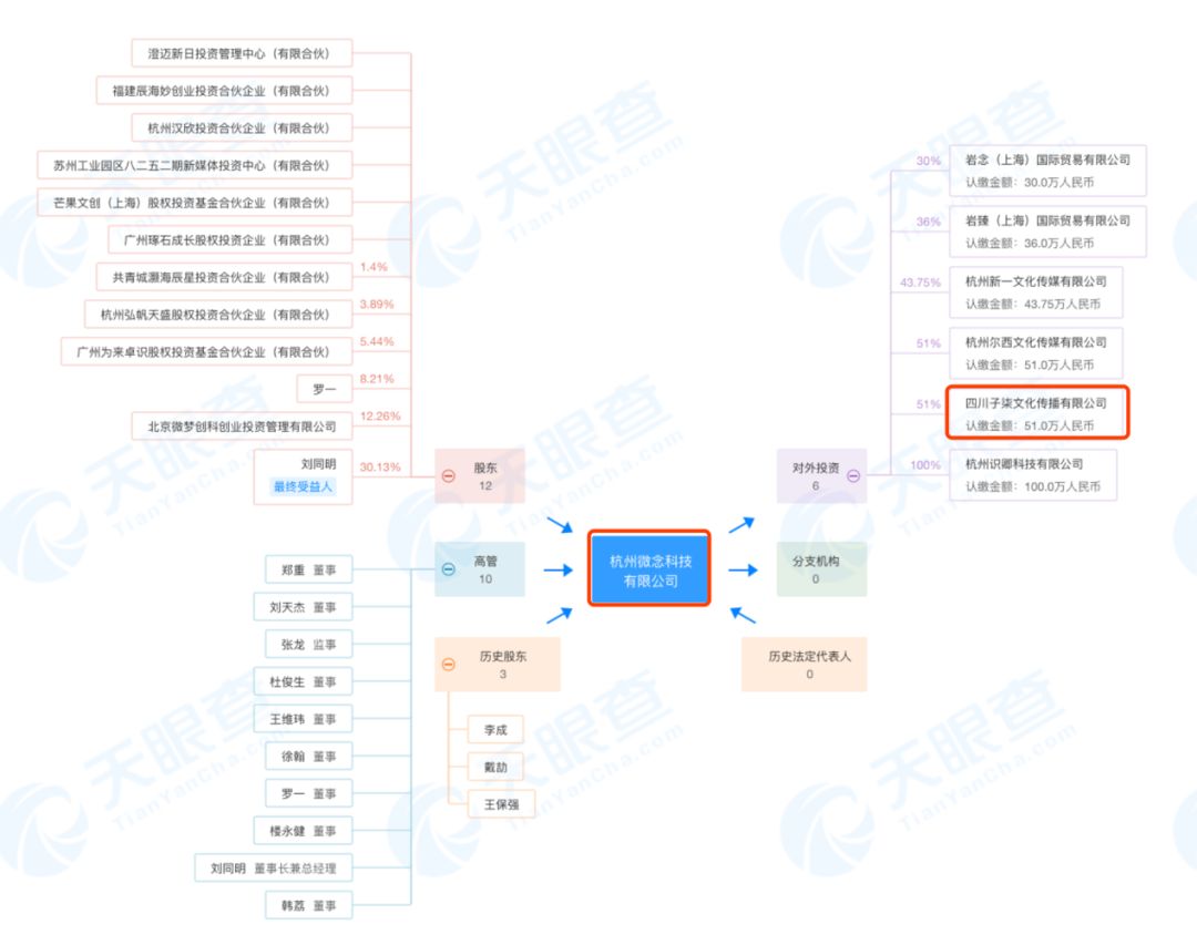 据天眼查显示,李佳佳(应为李子柒原名)在2017年7月20日成立了四川子柒文化传播有限公司,而微念正是它的股东,持股比例51%,刘同明任监事,李佳佳持股49%。