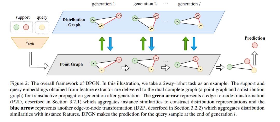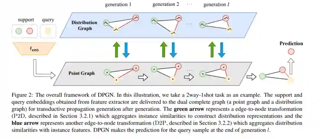 大多数基于图网络的元学习方法都对实例级关系进行了建模。我们进一步扩展了这个思想,以1-vs-N的方式显式地将一个示例的分布级关系建模为所有其他示例的分布级关系。提出了一种新的分布传播图网络(DPGN)学习算法。在每一个小样本学习任务中,它都传达了分布层次关系和实例层次关系。为了结合所有实例的分布级关系和实例级关系,我们构造了一个由点图和分布图组成的对偶完全图网络,其中每个节点都代表一个实例。DPGN具有双重图结构,可以在几个更新代中将标签信息从带标签的示例传播到未带标签的示例。在对小样本学习基准的大量实验中,DPGN在监督设置下的5% ~ 12%和在半监督设置下的7% ~ 13%的范围内都比最新的结果好得多。代码可以在https://github.com/megviiresearch/DPGN找到。