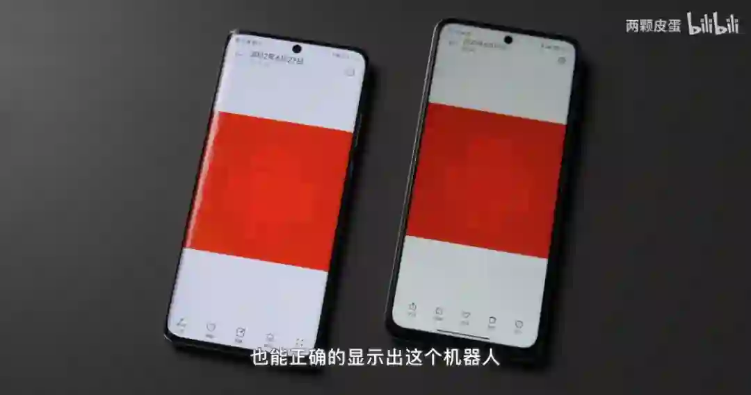 小米的原色模式跟华为的默认模式是一模一样的,图片正确按照广色域显示,UI 图标之类的都重新映射在 P3 色域之内,没有出现默认模式的过饱和的问题,但是华为的鲜艳模式跟小米的默认不一样,他竟然在这个模式下,也能正确的显示出这个机器人。