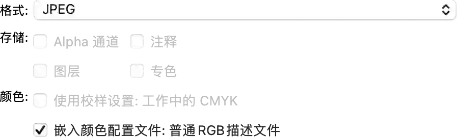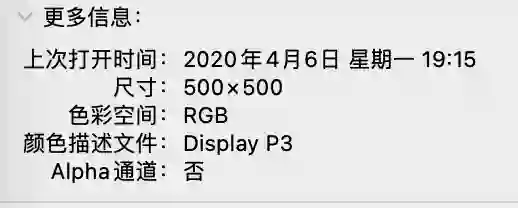 如果是 Photoshop 这样的作图软件,在新建一个文件时我们可以选择新建广色域的文件。修完图保存时,选项中同样也会提示我们是否嵌入颜色配置文件——这就是在文件里嵌入了标记,学名叫 ICC 配置文件。我们在 Mac 上查看文件信息时,就能在颜色描述文件这一项看到 sRGB 或者 Display P3。系统读取到这个标记,就知道要怎么还原色彩才是正确的。