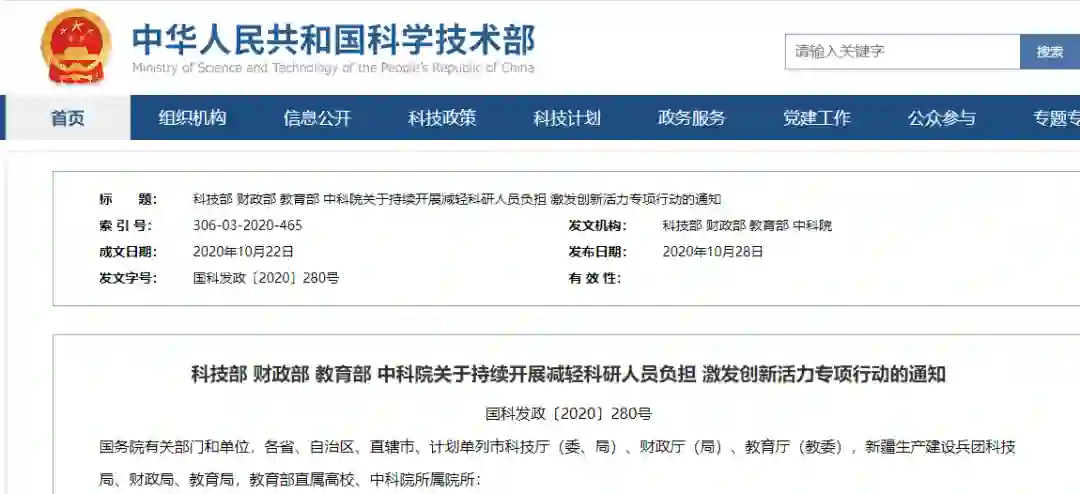 科技部网站今天(10月28日)发布了《关于持续开展减轻科研人员负担 激发创新活力专项行动的通知》,里面提出要开展专项减负活动,切实轻科研人员负担、激发创新活力,并制定了大量具体措施