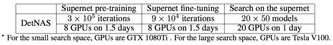 本文提出DetNAS方法,这是第一个用于搜索物体检测任务Backbone的框架。它由三个步骤组成:在ImageNet上预训练Supernet;在检测测数据集上微调Supernet;用遗传算法在训练好的Supernet上搜索。表4给出了每一步所消耗的GPU和时间。DetNAS的计算消耗(在COCO上为44GPU days)仅为训练一个常用物体检测器的两倍。实验结果显示,DetNAS的主要搜索结果的性能在COCO上超越了ShuffleNet和ResNet等传统手工网络结构。