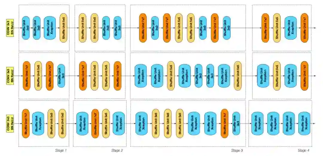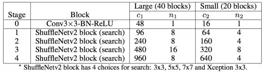 表1介绍了搜索空间的具体细节。本方法使用的搜索空间基于ShuffleNetv2的块(block)。ShuffleNetv2是一种高效轻量级的卷积网络架构,包含channel split与channel shuffle操作。研究员设计了两个不同大小的搜索空间,大的用于得到主要结果的网络搜索,小的用于消融实验。