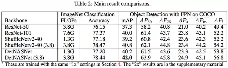 表2:两种设置下的DetNASNet与手工设计网络的性能对比