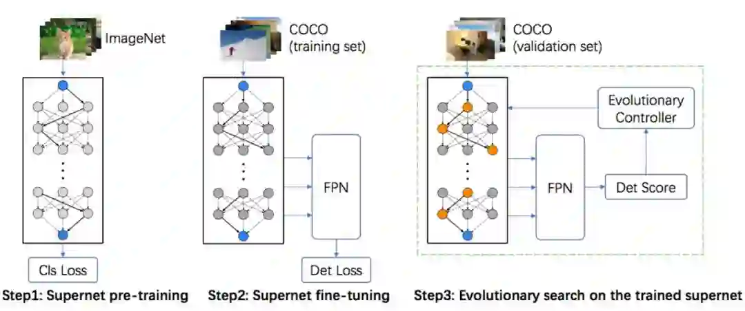 如图1所示,DetNAS由三步组成,1)在ImageNet上预训练Supernet,2)在检测数据集上微调Supernet以及,3)在训练好的Supernet上进行结构搜索。
