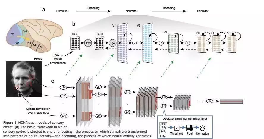 文献[13]也分析了深层神经网络与视觉神经之间的对应关系。他们利用目标驱动的深度学习模型来理解大脑的感觉皮层。具体的思路是用目标驱动的分层卷积神经网络(goal-driven hierarchical convolutional neural networks,简称HCNNs)对高视觉皮层区中单个单元和群体的输出响应进行建模。这种手段建立起了深层神经网络和大脑感知皮层的对应关系,能够帮助我们理解视觉皮层的机理。从另一角度看,也找到了深度神经网络在神经科学上的对应点。下图是神经网络与视觉皮层的结构和功能对比: