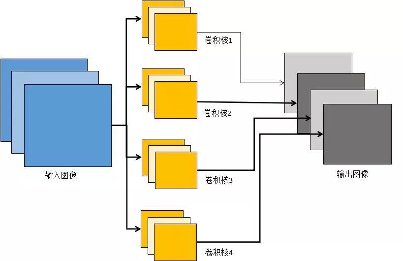 在上图中卷积层的输入图像是3通道的(图中第1列)。对应的,卷积核也是3通道的。在进行卷积操作时,分别用每个通道的卷积核对对应通道的图像进行卷积,然后将同一个位置处的各个通道值累加,得到一个单通道图像。在上图中,有4个卷积核,每个卷积核产生一个单通道的输出图像,4个卷积核共产生4个通道的输出图像。