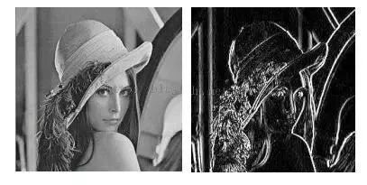 即以(x,y)为中心的的子图像与卷积核的对应元素相乘,然后相加。通过核卷积作用于输入图像的所有位置,我们可以得到图像的边缘图。边缘图在边缘位置有更大的值,在非边缘处的值接近于0。下图为Sobel算子对图像卷积的结果,左图为输入图像,右图为卷积后的结果:
