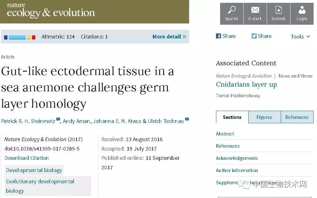 从进化的角度来看,形成消化系统的内胚层被认为在刺胞动物和其他动物之间存在进化相关性。Technau和同事们对这一假说进行了验证,他们对海葵肠道和胰腺的消化酶生成细胞的胚胎起源和典型的发育调控基因进行了追踪。研究人员发现,在海葵体内,生成消化酶和胰岛素的腺体细胞并非来自于内胚层,而是来自于外胚层。挪威卑尔根大学的PatrickSteinmetz说:“当我发现海葵的内胚层衍生物中并没有消化腺细胞时我感到非常困惑。这与生物学课本上讲的不一样。”