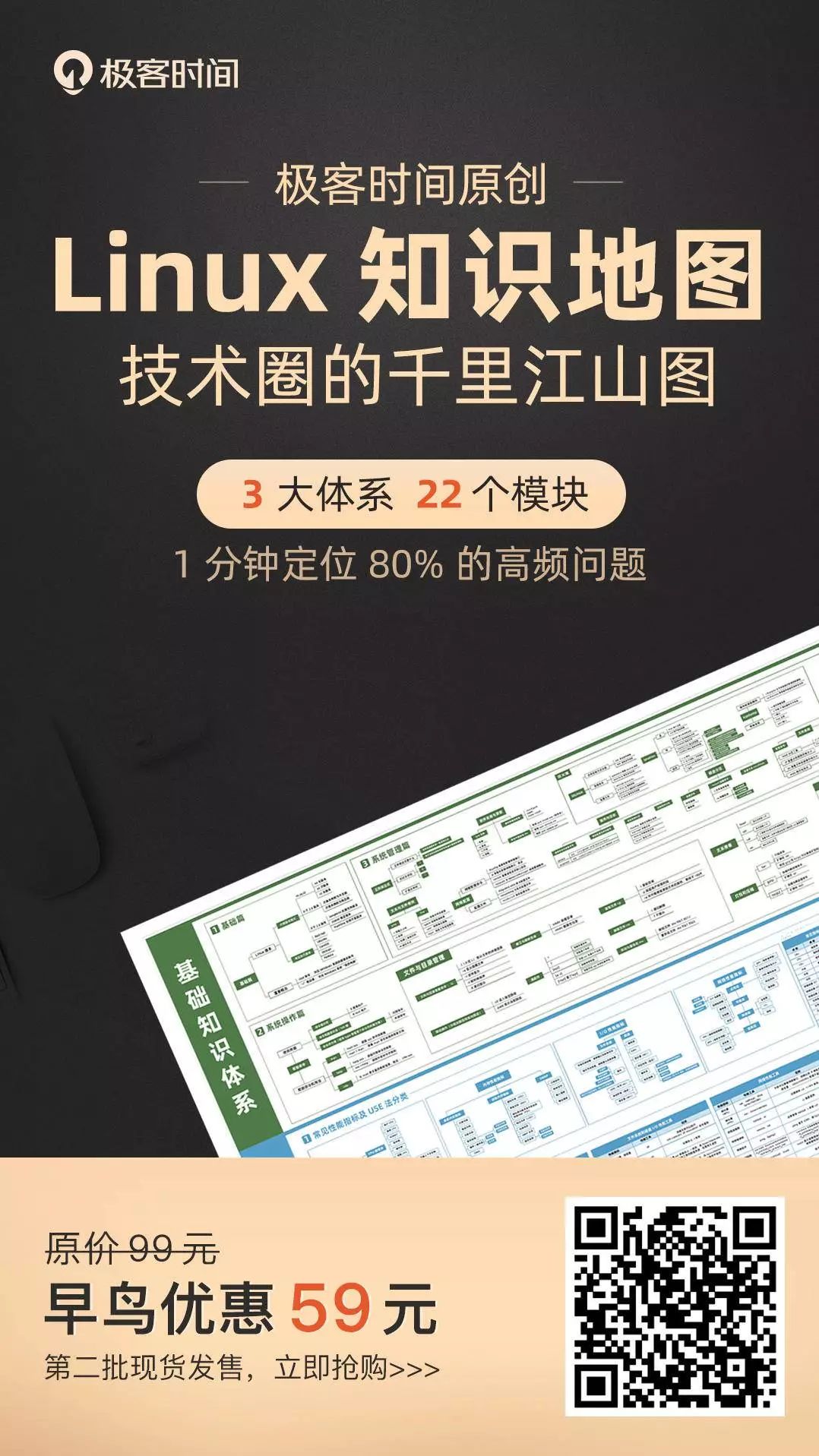 今天给大家推荐一个“大物件儿”,1.56 米(大概双臂展开长度)的 Linux 操作系统知识地图,极客时间团队出品,可谓 2019 年最硬核的 IT 技能图谱,以上问题都可以帮你解决。