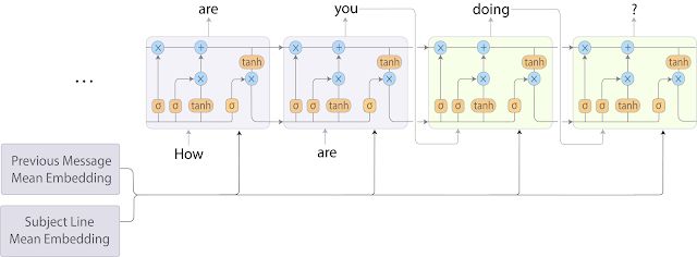 为了改善这一点,我们将 BoW 模型与 RNN-LM 结合起来,结合后的模型比 seq2seq 模型更快,而对模型的预测质量影响极小。在这种混合法中,我们通过把单词嵌套平均分配在每个区域内,对邮件主题和之前的电子邮件内容进行编码。然后我们将这些平均分配后的嵌套连接在一起,并在每次执行解码步骤时将它们馈送到目标序列 RNN-LM,过程如下面的模型图所示。