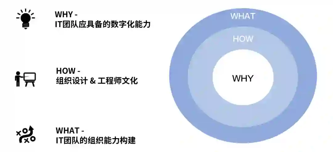 首先,IT 团队应该具备的数字化能力是什么,先讲 WHY,应该是什么样子;然后讲 HOW,主要分享两个方面:一个是组织设计,另外一个是工程师文化;最后讲 WHAT,以此做一个总结,即 IT 团队的组织能力构建应该是什么样子。