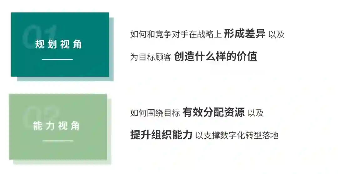 第一个角度是规划视角,即如何和竞争对手在战略上形成差异,以及为目标顾客创造什么样的价值。如果将它深入解读,即如何在战略上形成差异化的竞争力: