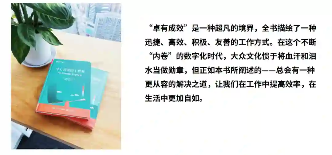 推荐一本书,《卓有成效的工程师》,今天很多内容也来自于这本书。我认为卓有成效是一种超凡的境界,全书描绘了一种迅捷、高效、积极、友善的工作方式,在这个不断内卷的数字化时代,很多人都习惯于把血汗和泪水当做勋章,我本人并不赞同,我认为一定有一种更加从容的解决之道,让我们在工作中提高效率,在生活中更加自如。