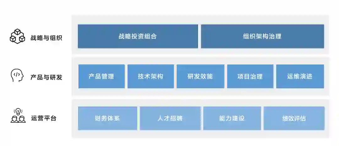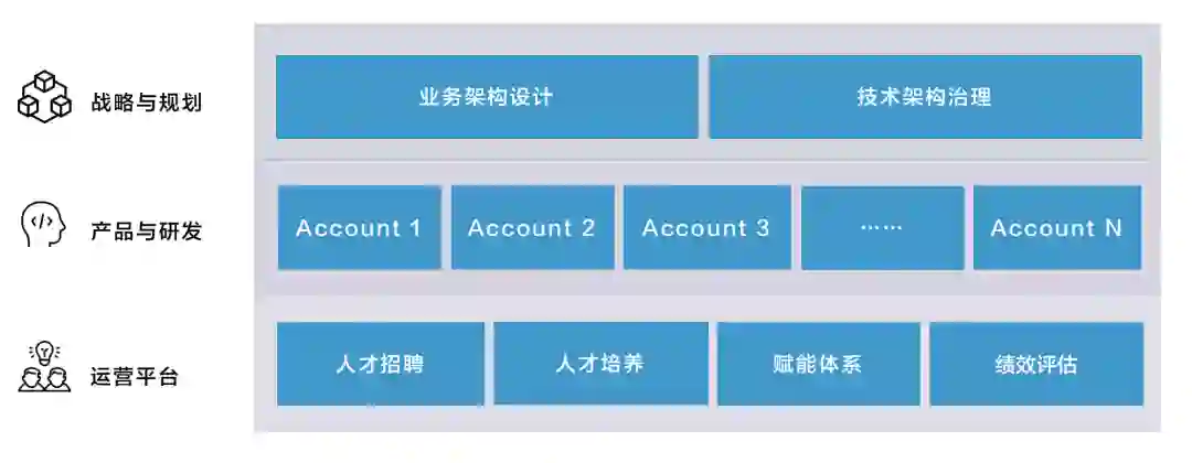 最上层的是战略与规划,包括业务架构设计,技术架构治理;中间一层围绕着各个 Account(你可以认为是各个产品线)的产品与研发。但是各个产品线之间往往会形成竖井,这是很难避免的,如何打破组织间的竖井?通过最上一层的战略与规划,通过业务架构设计,技术架构治理,能够横向地把能力打通;第三层,通过运营平台的人才培养、赋能体系、绩效评估,能够进行横向能力建设。