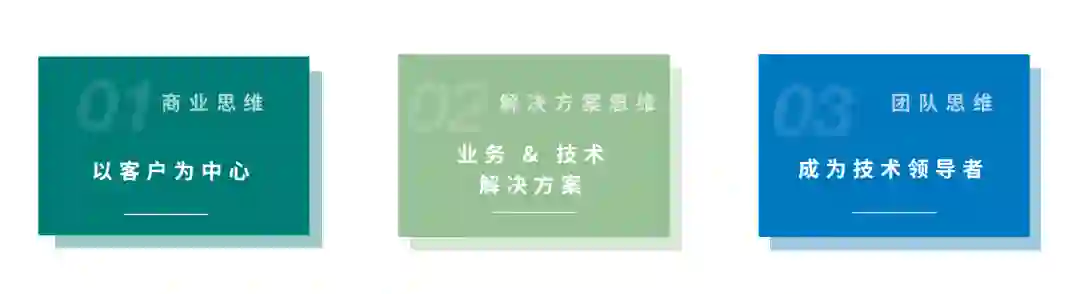 员工思维:需要具备三大思维,第一,商业思维,以客户为中心;第二,解决方案思维,如何去形成好的解决方案,包括核心团队、标准化的代码、标准化的解决方案等等;第三,团队思维,我提倡大家要有团队意识,成为技术领导者。