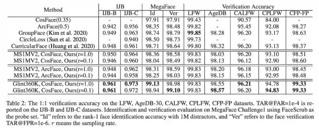 该研究在内部业务和FRVT竞赛上验证了这个方法,在学术界的测试集IJB-C和Megaface上,使用Glint360K的Full softmax和10%采样都有着相当不错的结果。