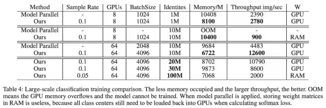 。这样每张GPU采样到的类中心一样多,实现负载均衡。后续的过程就是分类层的模型并行部分了,需要注意的是,只有采样出来的类中心的权重和动量会更新。
