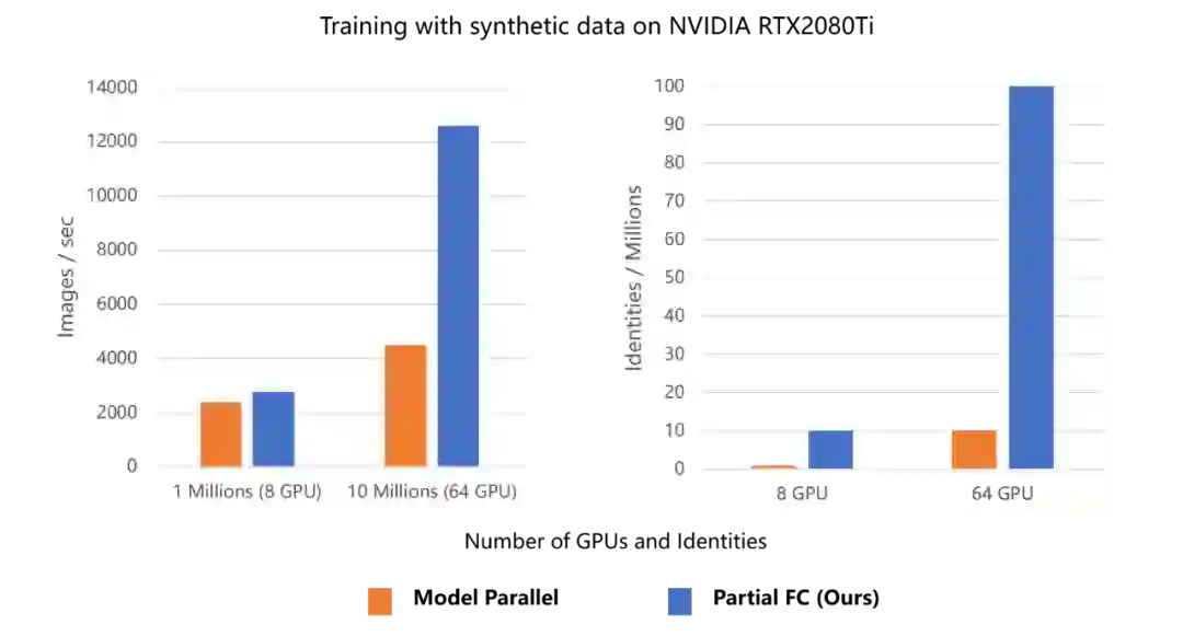 在64块2080Ti、类别数1000w的实验条件下,Partial FC 的速度是混合并行的3倍,占用的显存也更低,并且最大支持的类别数也有了一个数量级的飞跃,成功训练了一亿id的分类任务。