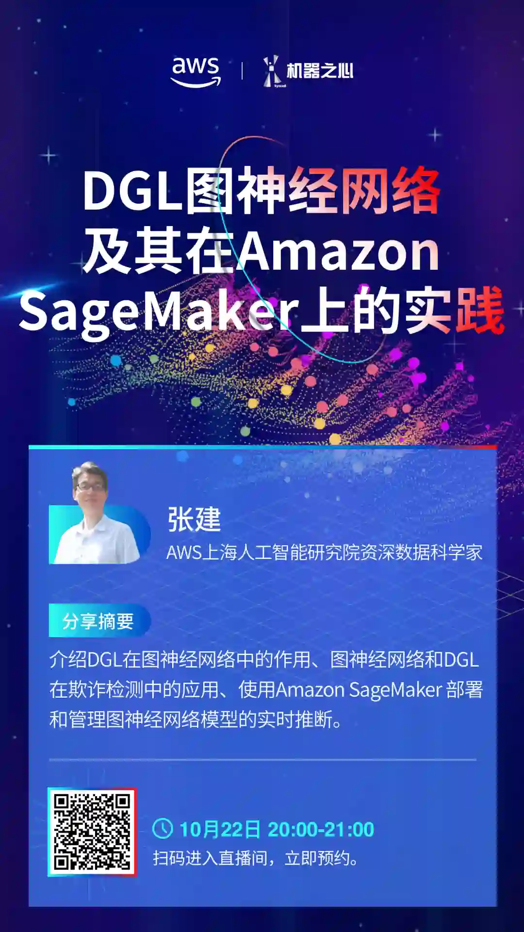 10月22日20:00,AWS上海人工智能研究院的资深数据科学家张建将分享讲解图神经网络、DGL在图神经网络中的作用、图神经网络和DGL在欺诈检测中的应用和使用Amazon SageMaker部署和管理图神经网络模型的实时推断。