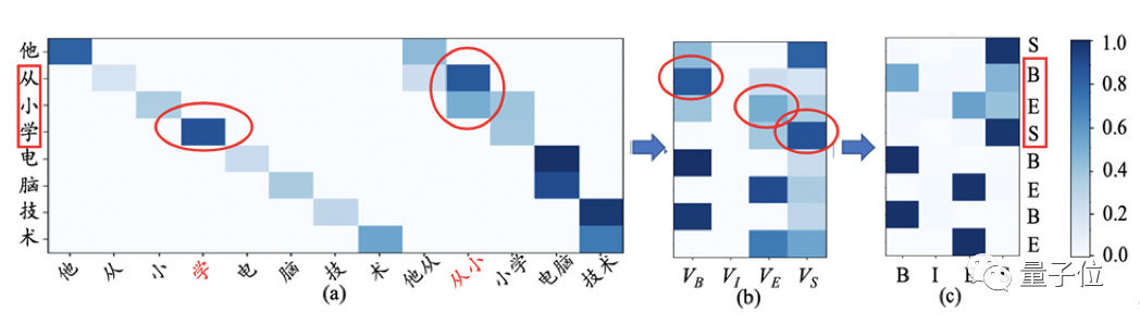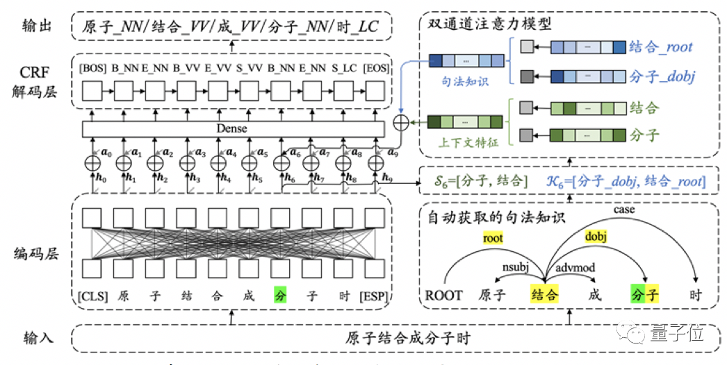 即便在自动获取的句法知识不准确的时候,该模型仍能有效识别并利用这种知识。例如,将前文有歧义、句法知识不准确的句子(“他马上功夫很好”),输入该双通道注意力模型后,便得到了正确的分词和词性标注结果。