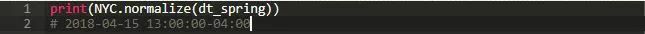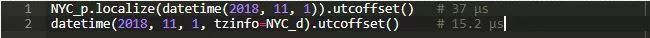 为什么时间偏移-04:56而不是-05:00? 因为那是在纽约采用标准化时区之前的当地太阳能平均时间,因此是美国/纽约时区的第一个入口。 为什么pytz会返回这种结果? 因为与标准库的懒惰计算时区信息模型不同,Pytz采用了一种立即计算方法。 每当你从一个初始的日期构造一个已知的日期时间,你需要调用它的本地化函数: