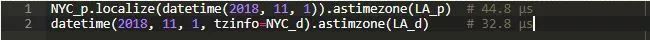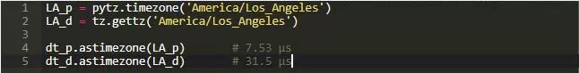 dateutil在这个操作中速度较慢,因为它需要计算纽约和洛杉矶的UTC偏移量,而pytz显然从UTC比从最初的日期时间能更快地创建本地化的日期时间(否则会花费至少另一本地化的代价)。 但是,如果您只计划在每个本地化日期时间内只进行一次时区转换,则操作的全部成本为: