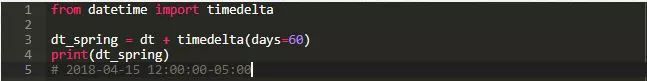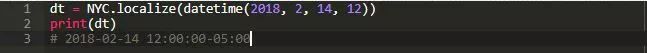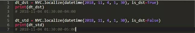 由于localize函数急切地将EST附加到日期时间,因此不会响应计算,不会更新偏移量。 为了解决这个错误,每当你在pytz-aware datetime上进行任何算术运算时,你都需要调用normalize函数: