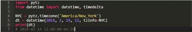 人们用pytz犯的最大错误就是简单地将它的时区附加到构造函数中,因为这是在Python中为日期时间添加时区的标准方式。 如果你尝试这样做,最好的情况是你会得到明显荒谬的东西: