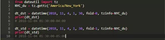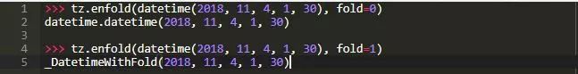 这是因为有些关于日期时间的信息(它表示的DST的哪一侧)现在被编码在附加到它的tzinfo中。 使用标准的Python接口,直到Python 3.6引入PEP 495才解决了这个问题,PEP 495将fold属性添加到了datetime类中。 这允许“我不确定的日期时间的哪一侧”的决策在日期时间本身进行编码,从而允许延迟计算不明确的日期时间。 如果dt.fold为0,则不明确的日期时间将解析为给定区域中第一次出现的时间,如果它为1,则它们解析为第二次出现。 这里给出代表上面的例子: