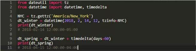 在日期时间模块中,Python提供对时区而不是时区偏移量的支持 - 也就是说,datetime.tzinfo对象预计不会提供固定的偏移量和名称,而是提供用于解释时区信息是什么的一组规则作为datetime的函数。 这就是下面这段代码会起作用的原因: