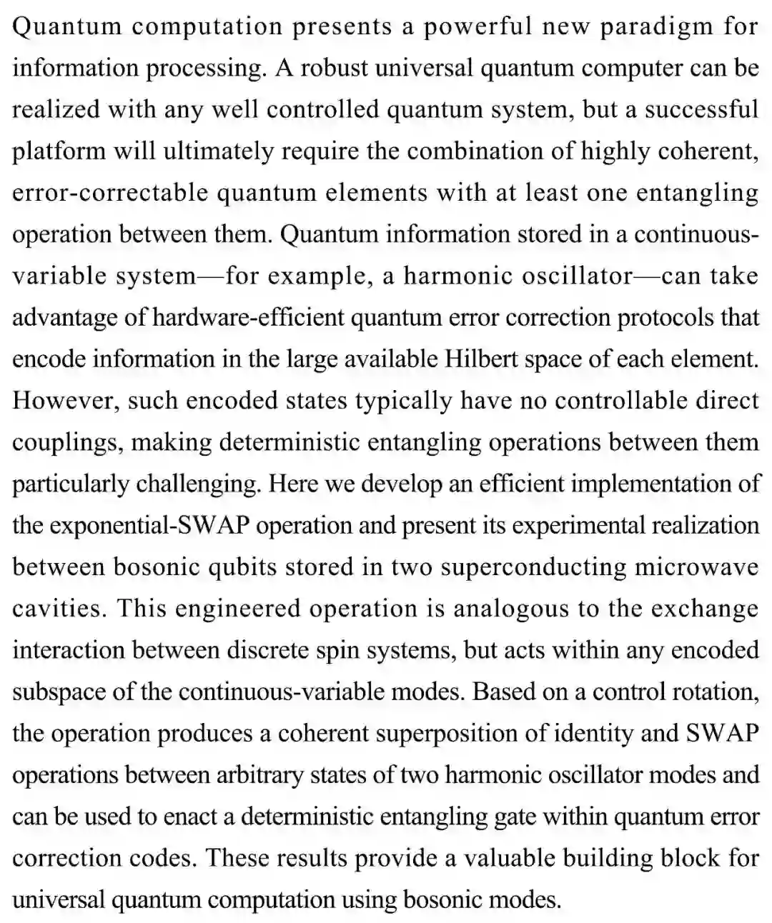 (导读 阿金)量子计算是信息处理的强有力新范例,任何控制良好的量子系统皆可实现鲁棒通用量子计算机。本研究展示一种SWAP指数操作的有效应用,实验条件下在两个超导微波空腔内实现玻色子量子比特存储。该操作可在连续变化模式的任何编码子空间中运作。研究结果为使用玻色子模式开发通用量子计算提供有效基础。