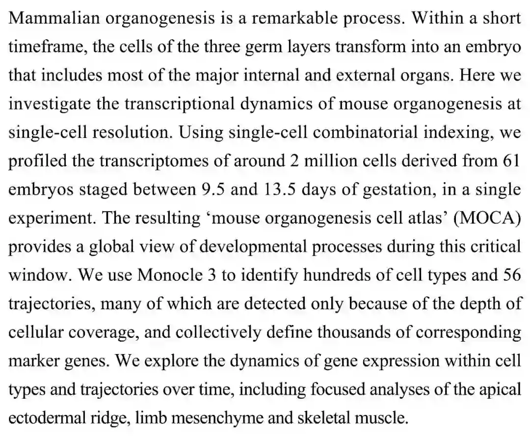 (导读 郭怿暄)哺乳动物器官发生过程中三个胚层细胞迅速转化为一个包含绝大多数主要内、外器官的胚胎。本研究利用单细胞组合索引技术对妊娠9.5天-13.5天的61个小鼠胚胎进行转录组分析,建立小鼠器官发生细胞图谱,通过Monocle 3发现数百个细胞类型和56条分化轨迹,并对随时间变化细胞类型和轨迹中基因表达的动态变化进行探索。