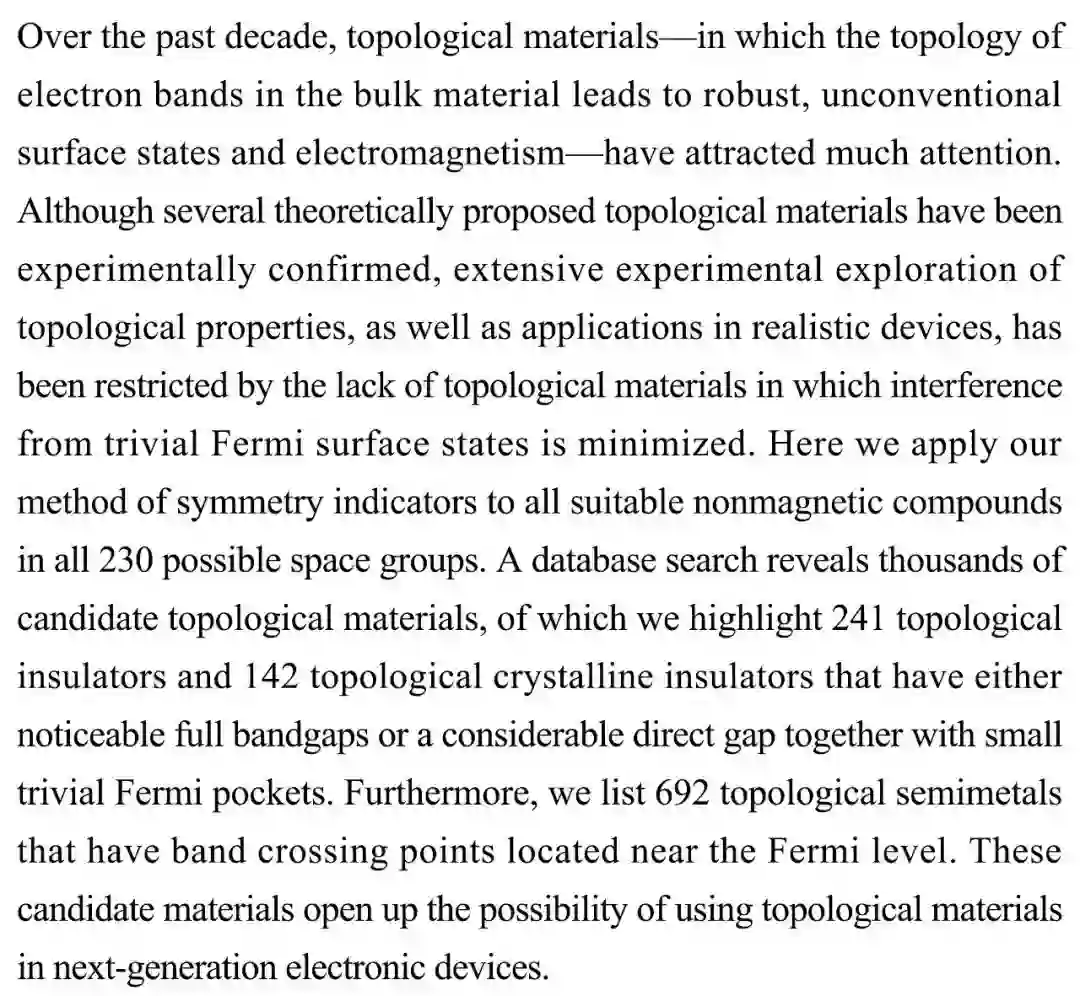 (导读 卓思琪)过去十年,拓扑材料广受关注。尽管实验证明了一些理论上的拓扑材料是存在的,但是由于拓扑材料的缺乏,进一步的实验研究和实际应用受到限制。本研究应用对称指示理论,开发了一套高效寻找拓扑材料的方法。该方法针对230个可能空间群中所有合适的非磁性化合物。数据库显示了数以千计的候选拓扑材料,这些候选材料为拓扑材料在下一代电子设备中的应用提供了可能性。