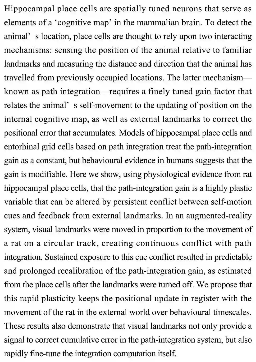 (导读 页一)海马位置细胞是组成哺乳动物大脑中“认知地图”的元素,依靠感知自身与地标间的相对位置,以及测量自身移动的距离和方向这两种交互机制来实现定位,后者也称为路径整合。本研究通过大鼠实验表明,海马位置细胞路径整合中的增益因子会根据自身感知和外部地标反馈之间持续的矛盾而重新校准。这种极快的可塑性使得大鼠在外部世界的移动过程中能够实现行为时间尺度上的实时定位。