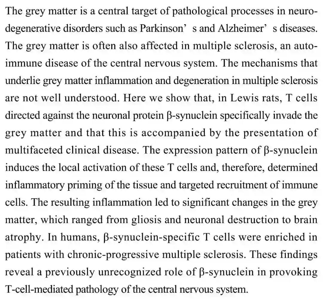 β-突触核蛋白反应性T细胞诱导自身免疫性中枢神经系统灰质退化
