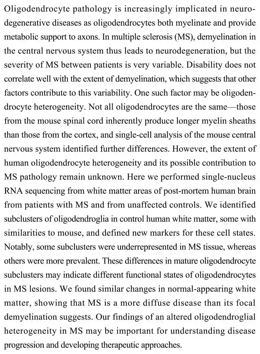 在多发性硬化症中人类少突胶质细胞异质性的改变