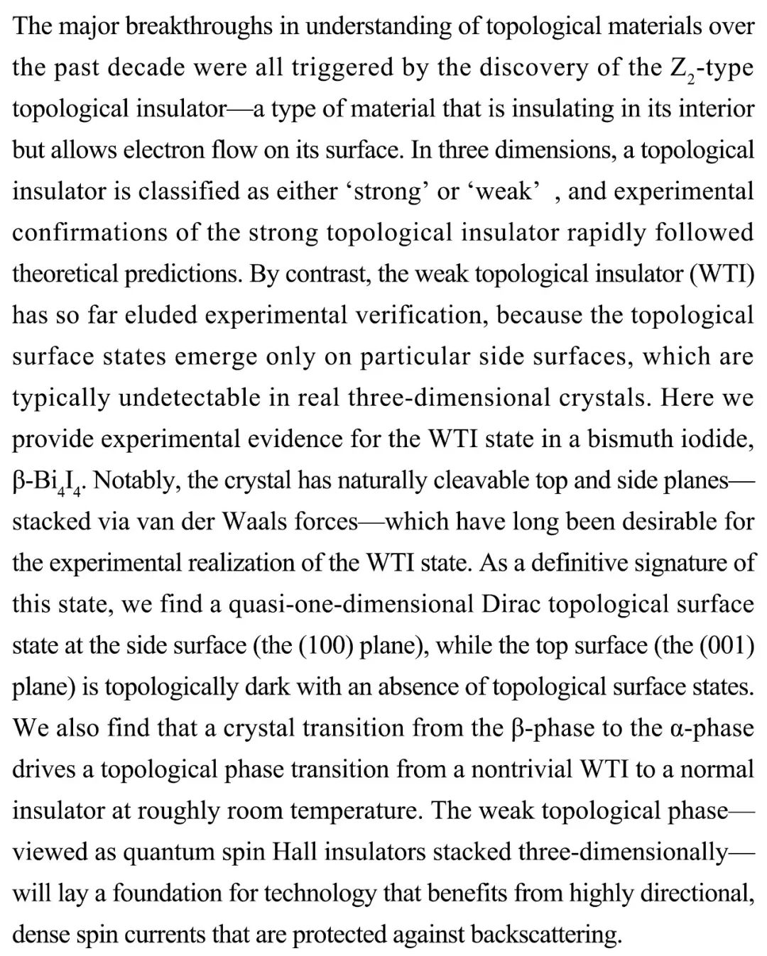 (导读 阿金)三维尺度下拓扑绝缘体有“强”“弱”之分,实验已证明强拓扑绝缘态的存在,而弱拓扑绝缘体(WTI)尚无证明。本研究在碘化铋(β-Bi4I4)晶体内证明存在WTI态,发现其关键特征——在晶体侧面出现准一维狄拉克拓扑表面态,而顶部表面没有。在室温下,其晶体相变能改变其拓扑相变。该结果为实现高度定向且致密自旋电流技术打下基础。