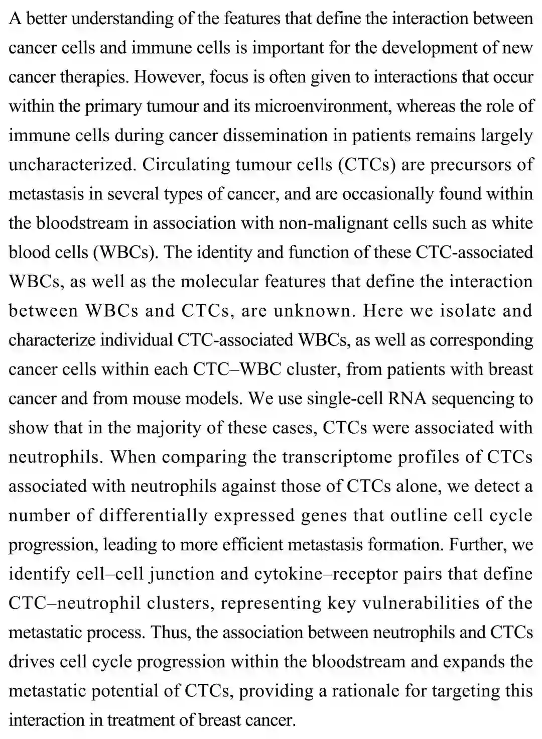 (导读 Chen^W^J)本研究使用单细胞RNA测序,在乳癌患者和小鼠模型中发现,循环肿瘤细胞(CTC)与中性粒细胞相关。中性粒细胞相关CTC与单独CTC转录组谱中部份异表达的基因促进细胞周期导致高效转移。此外,细胞间及细胞因子与受体的连接定义了CTC-中性粒细胞簇,同时也是转移的关键。因此,CTC-中性粒细胞的关系促进细胞周期并增强其转移潜力,为乳癌治疗提供新靶标。