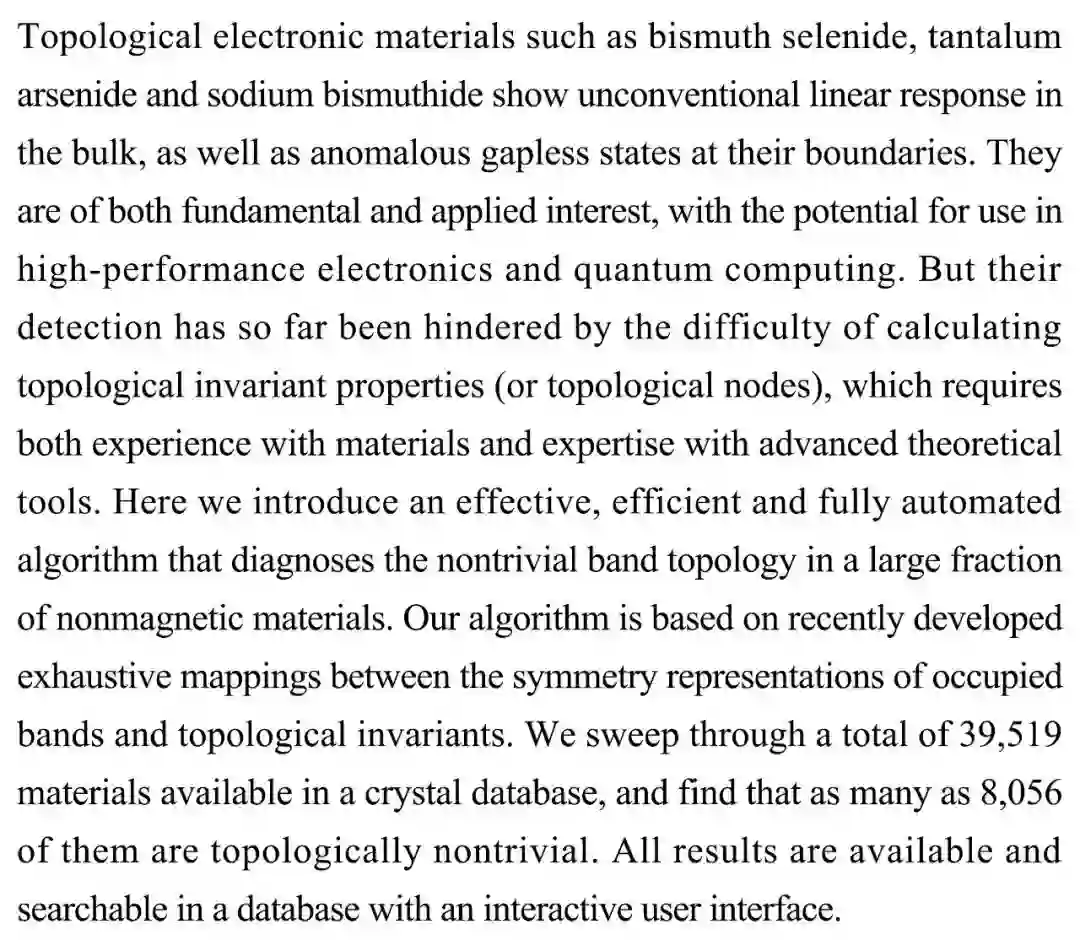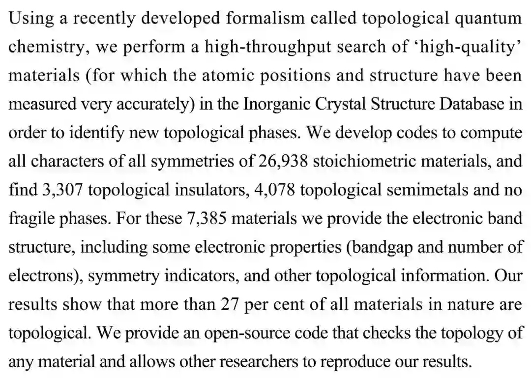 (导读MQ)该研究通过在无机晶体结构数据库中对“高质量”材料(原子位置和结构已被精确测量)的高通量筛选,开发代码来计算26,938个化学计量材料的所有对称性的所有特征,找到3,307个拓扑绝缘体,4,078个拓扑半金属且没有脆性相,并提供其电子能带结构信息。研究结果表明,自然界中超过27%的材料是拓扑的。该研究提供了一个开源代码,用于检查任何材料的拓扑结构,并允许其他研究人员重现该研究的结果。
