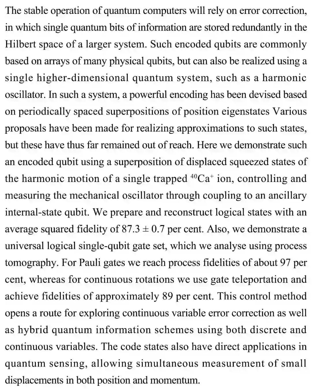 (导读 阿金)量子计算机的稳定操作依赖纠错能力,即能将单个信息的量子比特存储在更大系统的希尔伯特空间中。本研究使用一个被捕获的钙40离子在谐波运动中位移压缩态的叠加来编码量子比特,通过与辅助内态量子比特耦合,来控制和测量机械振荡器。由此准备、重构出的逻辑态平均保真度为87.3 ± 0.7%。该方法为探索连续变化的纠错和混合量子信息方案提供有效途径。