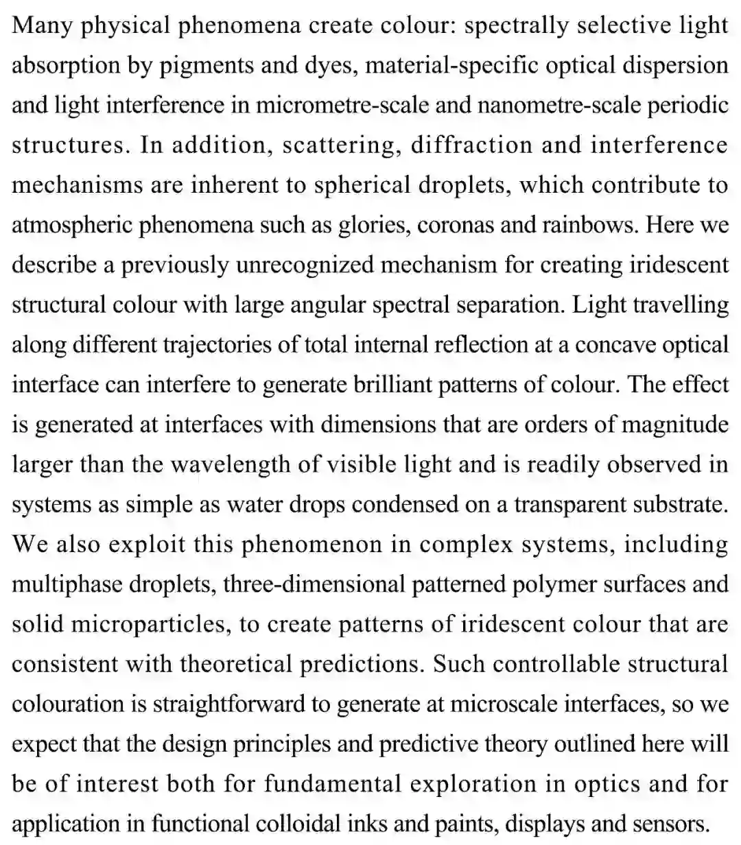 (导读 页一)本研究介绍了一个之前未被发现的机制,能用大角度光谱分离来制造彩虹色。当光沿着光学凹面的不同轨迹进行全内反射,光的干涉会产生绚烂的彩色图案。产生这种现象的凹面尺寸比可见光波长大几个数量级,并可在水滴或是其他复杂结构中观测到。这种在微尺度凹面产生颜色的方法非常简单,有望在光学基础研究和油墨等领域得到应用。