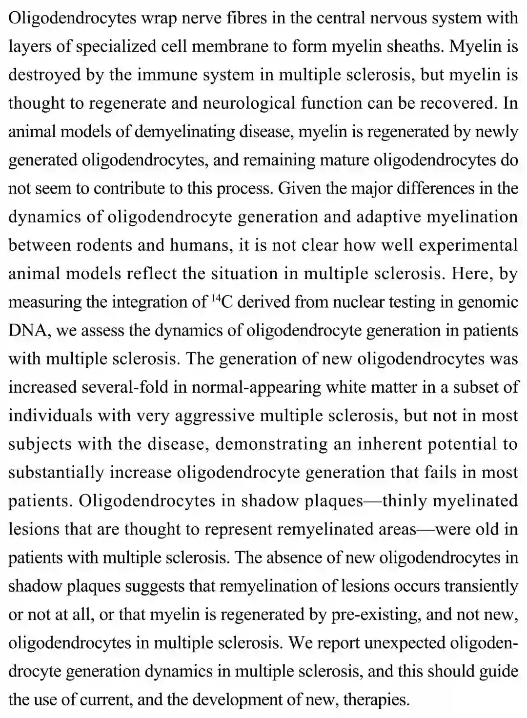 (导读 王思菲)少突胶质细胞形成的髓鞘在多发性硬化症(MS)患者中破坏,但能否再生尚不明确。本研究通过将碳14整合进基因组DNA发现少数侵袭性强的MS患者正常白质中少突胶质细胞产生增加数倍,但多数患者并无增生。MS患者影斑区无新生少突胶质细胞提示髓鞘修复为一过性或事先存在的少突胶质细胞参与修复。这一发现将对目前和未来治疗方案的开发具有指导意义。