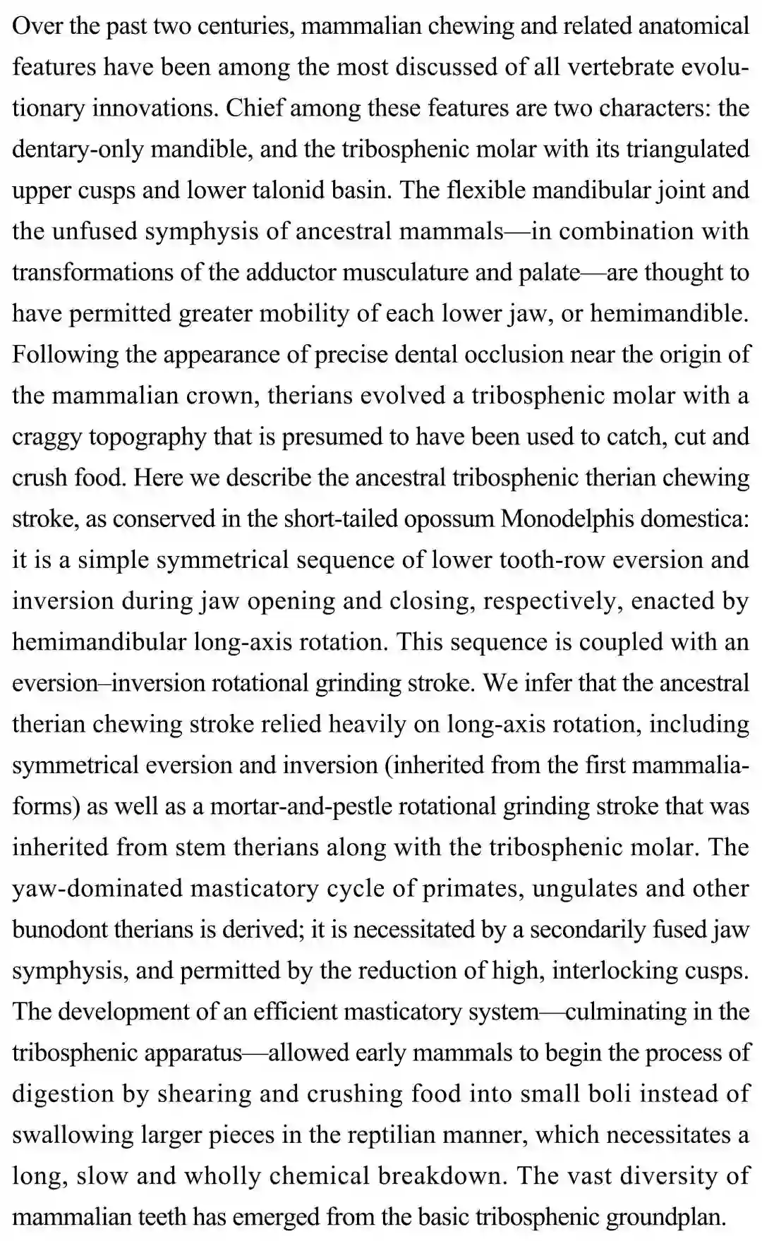 (导读 页一)仅由齿骨构成下颌和磨楔式臼齿是哺乳动物咀嚼相关主要解剖特征。本研究描述了哺乳动物祖先简单对称的咀嚼过程:在下颌张开合拢过程中下排牙齿随单侧下颌长轴旋转而外翻和内收,配合外翻-内收式旋转碾磨。该过程高度依赖下颌长轴转动。这种高效咀嚼模式使哺乳动物能够将食物嚼碎后消化,是各种哺乳动物牙齿演化基础。