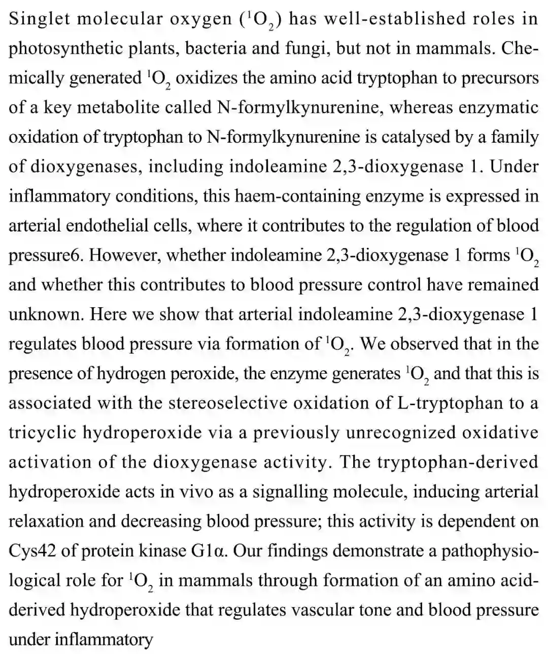 1O2)。1O2诱导动脉舒张、降低血压。该活性依赖蛋白激酶G1 α 的Cys42。该发现揭示了1O2在哺乳动物中的病生理作用。
