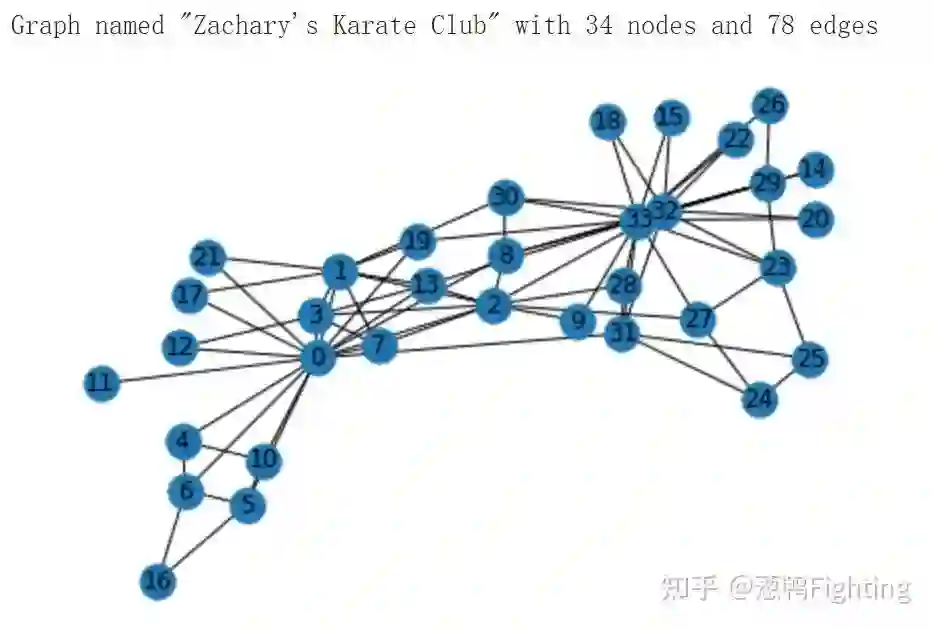 # 导入networkx自带的网络数据集 karate club 作为示例测试代码G = nx.karate_club_graph()# 打印查看网络的基本信息以及可视化print(nx.info(G))nx.draw(G, pos=nx.spring_layout(G), with_labels=True)
