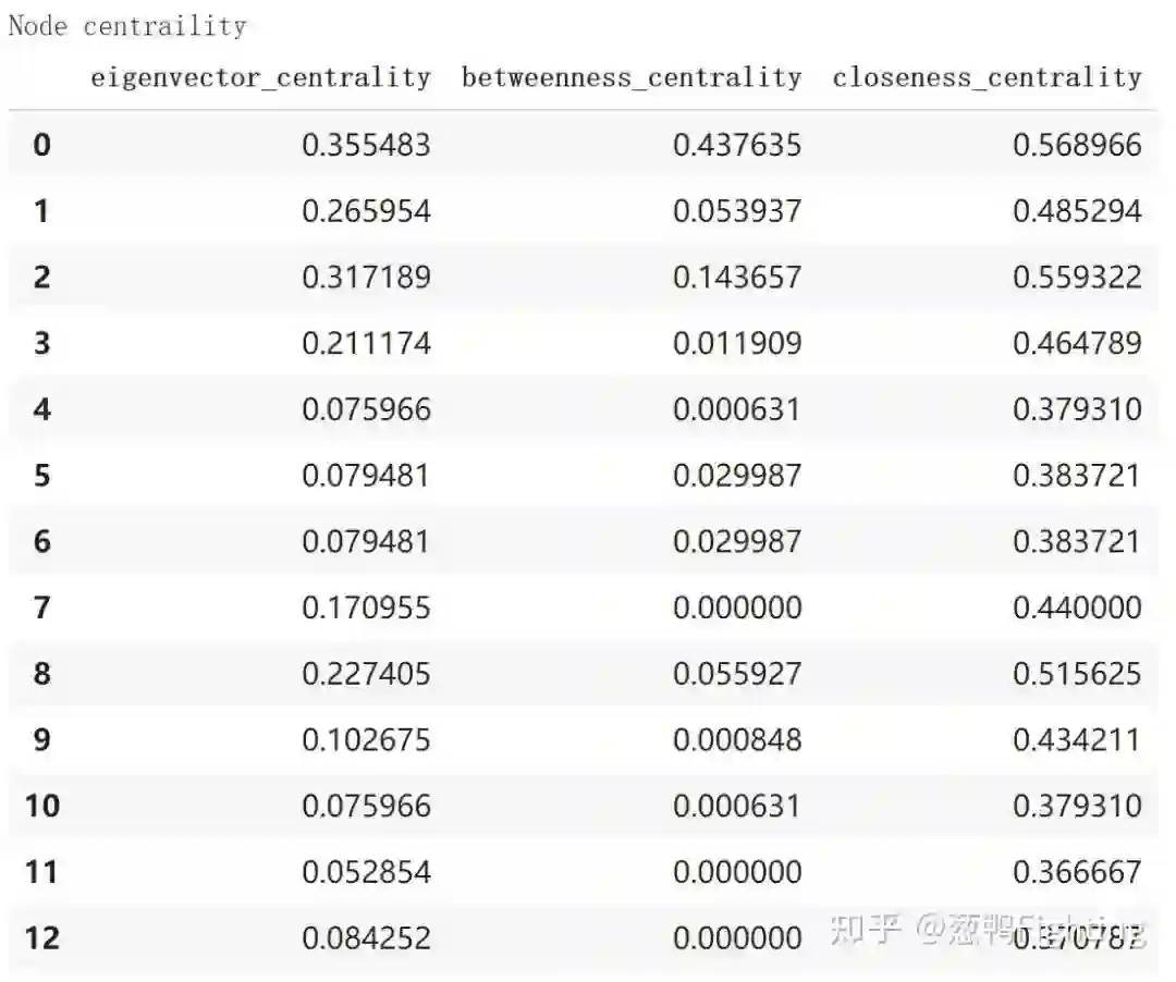 # 打印查看各种节点中心性数值# 各个中心性函数返回的是字典类型数据,key为节点index,value为中心性数值print("Node centraility")eigen_dict = nx.eigenvector_centrality(G)betw_dict = nx.betweenness_centrality(G)close_dict = nx.closeness_centrality(G)centrality_df = pd.DataFrame( { 'eigenvector_centrality': [eigen_dict[v] for v in G], 'betweenness_centrality': [betw_dict[v] for v in G], 'closeness_centrality': [close_dict[v] for v in G], })centrality_df