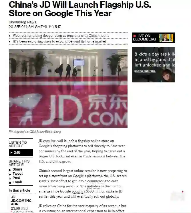 京东公司将于年底前在谷歌的购物平台上推出一家旗舰网上商店,直接向美国消费者销售。这个平台是谷歌打入电子商务、赚取更多广告收入的最新举措。此举是谷歌今年稍早斥资5.5亿美元,买进京东股份以来的第一步行动,最终将在全球推出网店。京东物流战略总监包燕表示,谷歌购物推出时,京东将会有旗舰店,谷歌会处理付款和订单。(彭博)